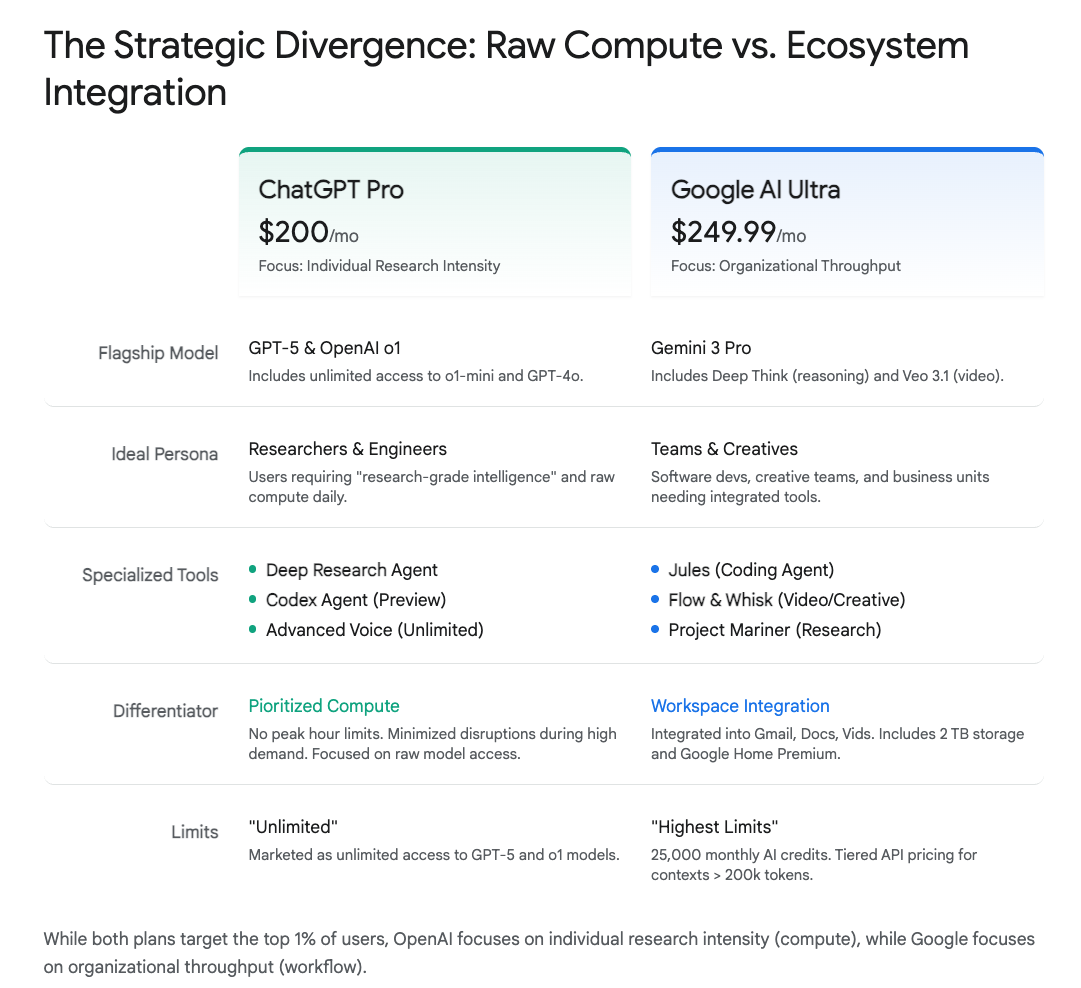 For the last two years, we got used to "flat-rate intelligence"—access to the smartest models for the price of a few coffees. That $20 price point established a psychological baseline. Now, with the release of OpenAI’s ChatGPT 5.2 Pro ($200/mo) and Google’s Gemini 3 Ultra (~$250/mo), we are shattering that ceiling and entering an economy of "super-premium" tools. (I am not personally a Claude fan but they too have Claude Max for $100-$200/mo).