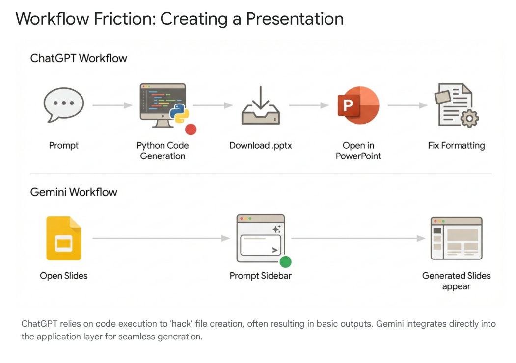 Where ChatGPT scripts document creation from the outside (often relying on Python scripts to generate files), Gemini lives inside your documents. It solves the "last mile" problem of workflow integration.
