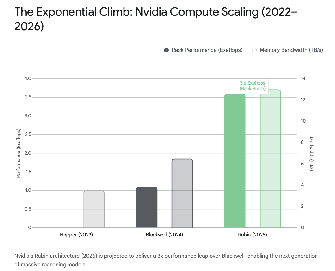- Compute: Nvidia’s upcoming Rubin architecture is pushing compute density to exascale levels (3.6 exaflops per rack), but energy is the new bottleneck.