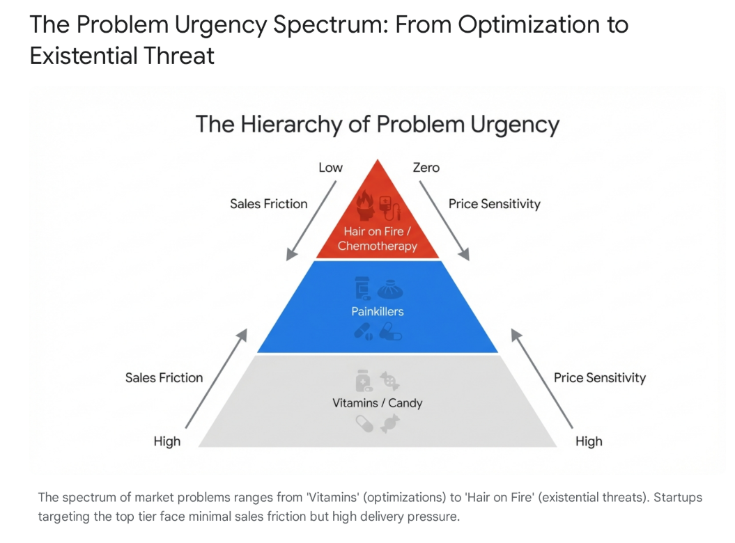 - Vitamins (Optimizations): These are "nice-to-have" improvements. They appeal to a user’s desire for efficiency, self-improvement, or long-term health. But like skipping a daily vitamin, the biological feedback loop is weak. If you skip it, nothing happens immediately. Consequently, sales cycles are long, churn is high, and price sensitivity is extreme because the user must be "educated" on why they need it.