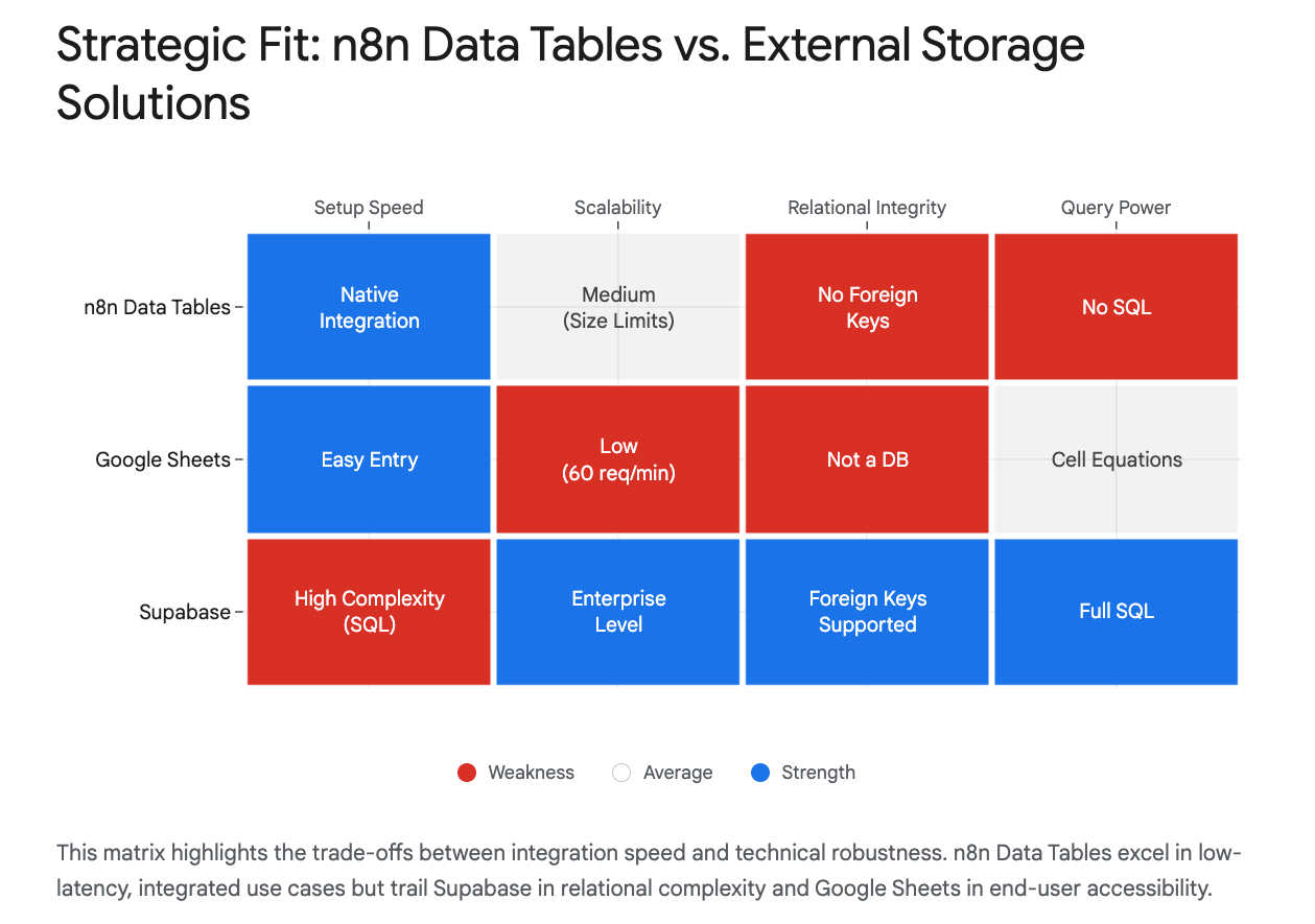 We must distinguish between solving existential, complex data problems)and optimizing lightweight storage. n8n Data Tables are for the latter case. They are not a replacement for your core Data Warehouse or high-velocity transactional systems.