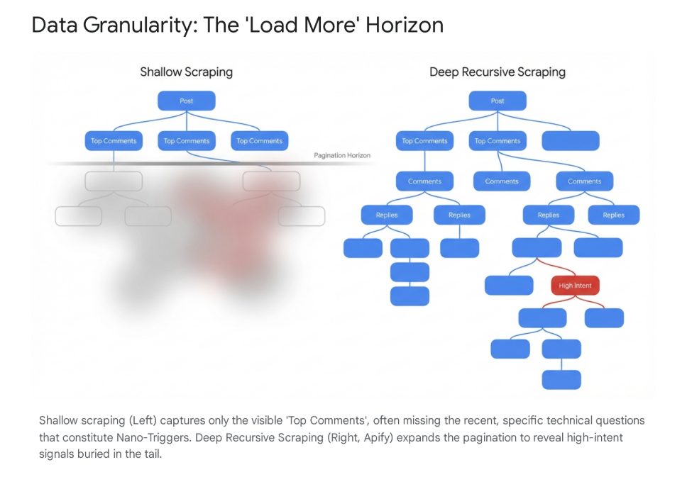 - Capabilities: Apify allows you to run dockerized scripts (Actors) that can simulate a complex human browsing session. It can perform deep recursion—clicking "load more comments" twenty times to find a buried implementation question. It returns raw, rich JSON data containing every available metadata field.