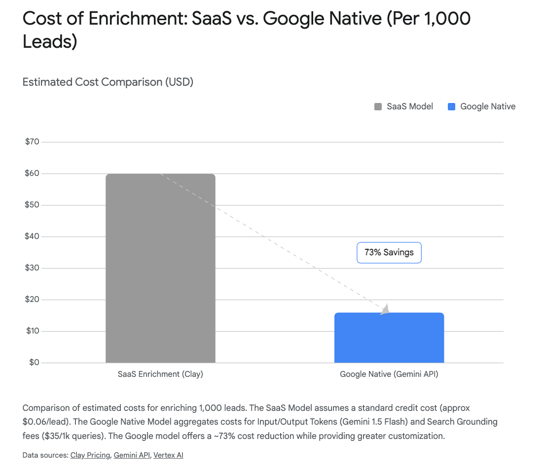 - The Primary Cost Driver: The main expense in the Google stack is "Grounding with Google Search" ($35 per 1,000 queries). While this is the most expensive component, it is critical for retrieving live data—such as a company's current pricing page or a prospect's LinkedIn headline—rather than relying on stale training data. Even with this fee, the total cost per lead is often significantly lower than the effective per-lead cost of premium SaaS credits that wrap similar functionality.