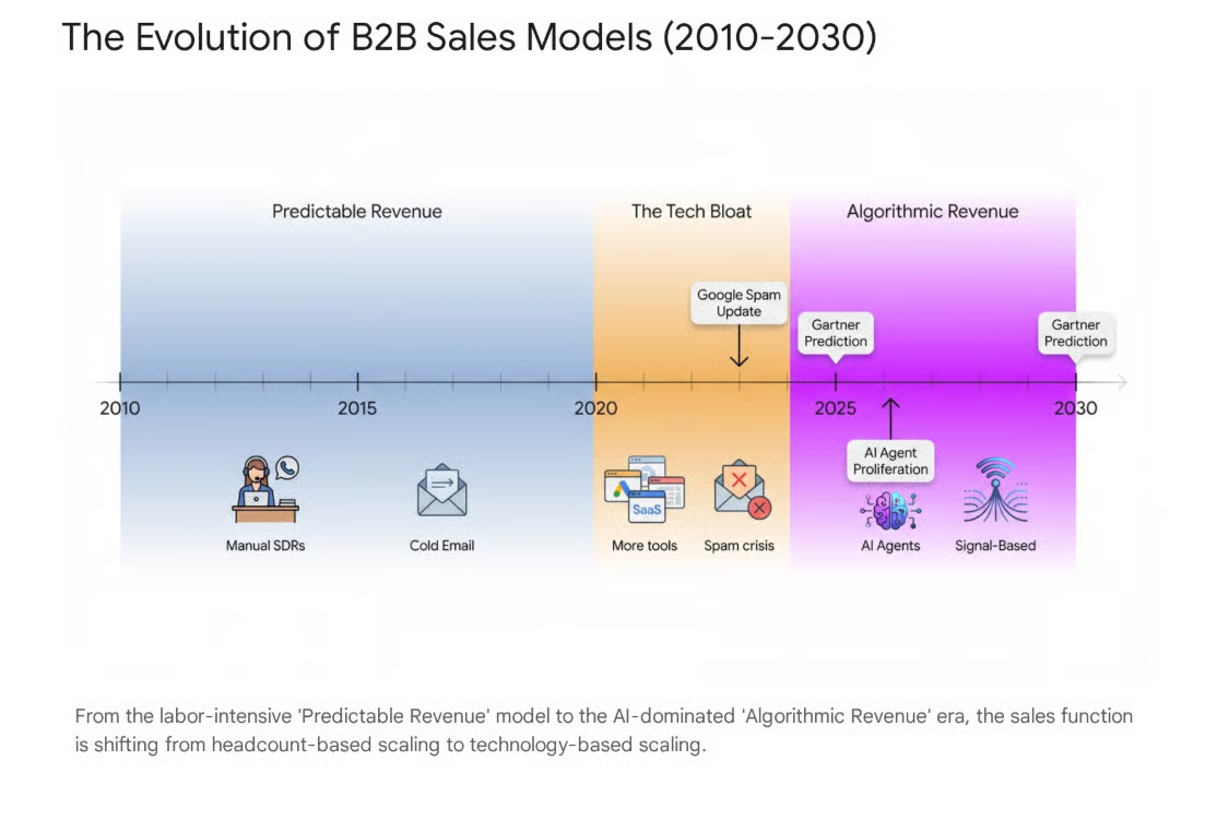 For the last 15 years, we’ve all been operating on the "Predictable Revenue" model. You know the drill: hire a battalion of SDRs, arm them with scripts, point them at a list of cold leads, and wait for the meetings to roll in. It was the assembly line applied to intellectual labor—a linear equation where More Activity = More Revenue.