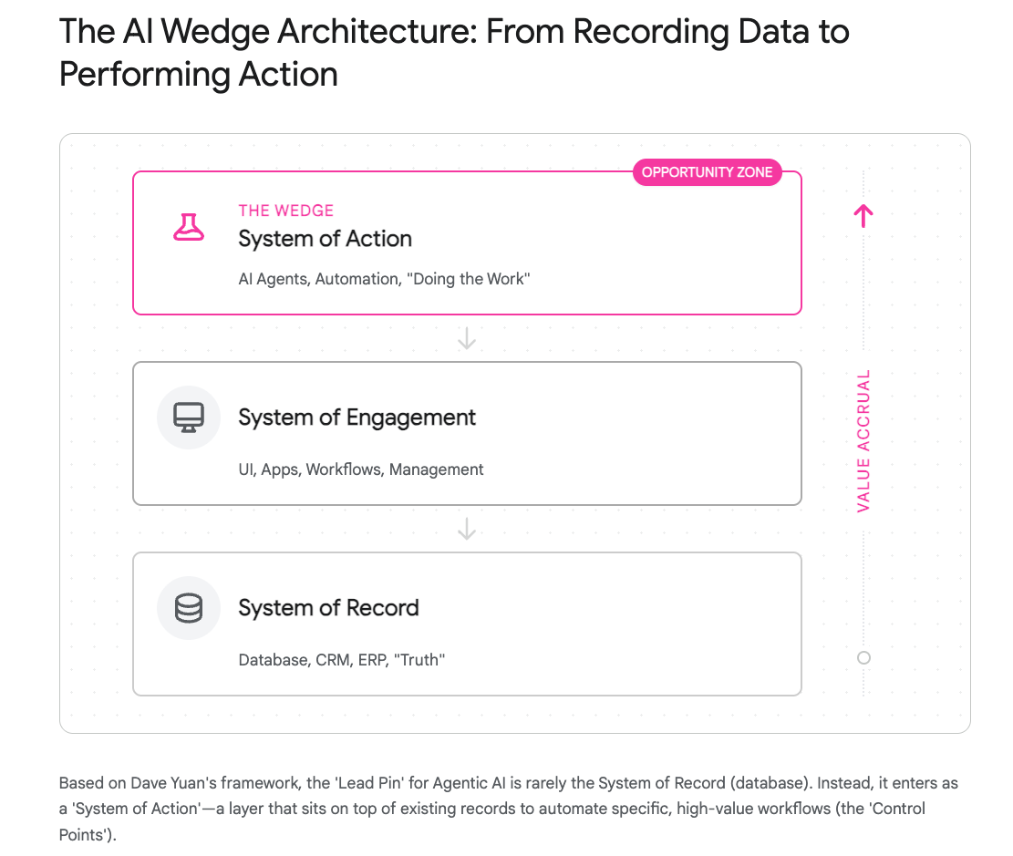 The System of Action (Dave Yuan): Yuan advises against trying to replace a company’s "System of Record" (like their massive ERP or CRM) on Day 1. Instead, look for the "System of Action"—the mission-critical workflows that sit on top of those databases. Find the specific, high-friction step where the "Hero User" is drowning in manual drudgery (e.g., the specific reconciliation process that keeps the CFO awake at night).